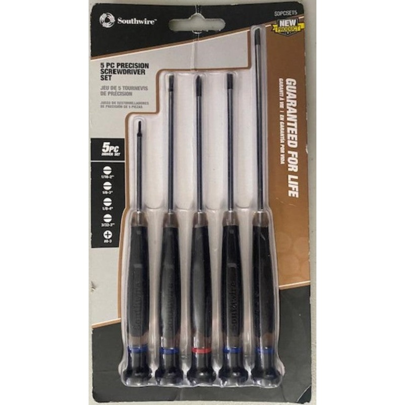 Southwire Sdpcset5 5 Pc Precision Screwdriver SetINCLUDES 1/16-2", 1/8-3", 1/8-4", 3/32-3" Slotted and #0-3 PhillipsSPINNING CAP for controlled one handed useCUSHION GRIP HANDLE - patent pendingCORROSION RESISTANT shankCOLOR CODED RINGS for quick identific