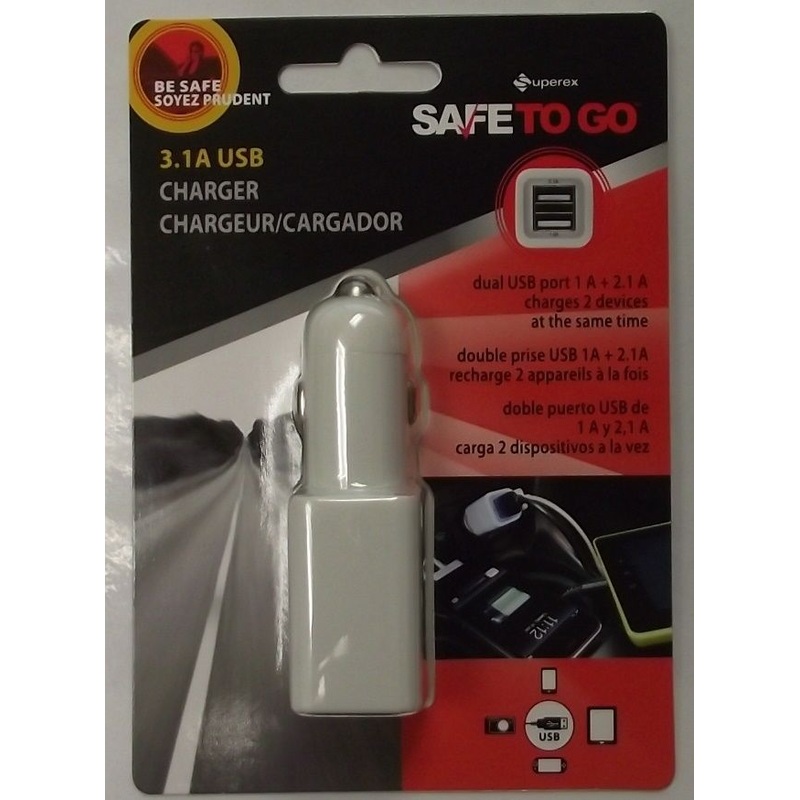 Superex 16-894 3.1 Amp Dual USB Charger3.1 Amp USB dual port charges 2 devices at the same time for example 1a smart phone and 2.1a TabletCompatible with a variety of electronic devicesPlugs into a 12v vehicle outletCircuit protection and overcharge protec