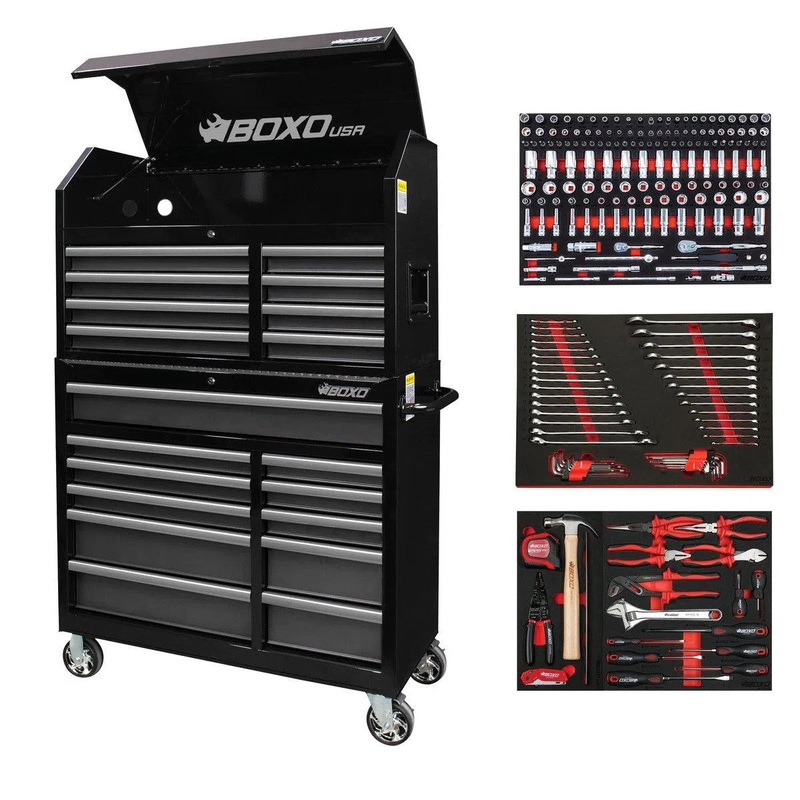 Our 41″ Black Tech Series Top & Bottom Box now with the popular 222-piece Metric and SAE master tool set. A great tool set to get you started containing the most widely used metric and SAE tools; 1/4″ and 3/8″ 90-tooth ratchets, extensions and both 6-point standard and 12-point deep sockets, smooth jaw open end wrenches, screwdrivers, pliers and more. Tools are made from chrome vanadium steel set in an EVA foam tool storage insert to keep your tools organized. Ideal set up to keep your shop, garage or office tidy.