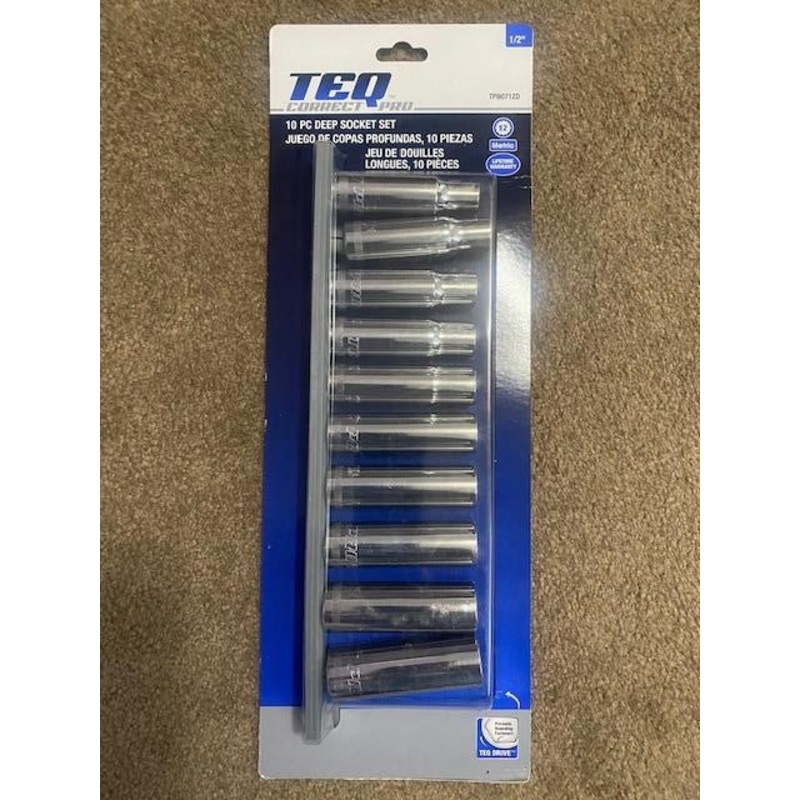 TEQ Correct 80712D Metric 10-Pc 1/2" Drive 12-Pt Deep Socket Set W/ Socket RailIncludes:10mm 11mm 12mm 13mm 14mm 15mm 16mm 17mm 18mm 19 mm w/ Socket RailFeatures and BenefitsOff-corner loading design reduces fastener roundingChamfered opening quickly guide