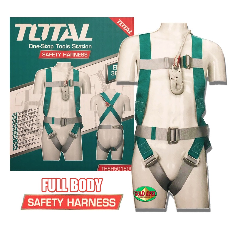 TOTALFull Body Safety Harness1 attachment point4 adjustment pointMaterial:High StrengthPolyesterWebbing Width:50mmSafety rope Size : 13mm*1.5mSafety rope material: PolyesterPacked by color box