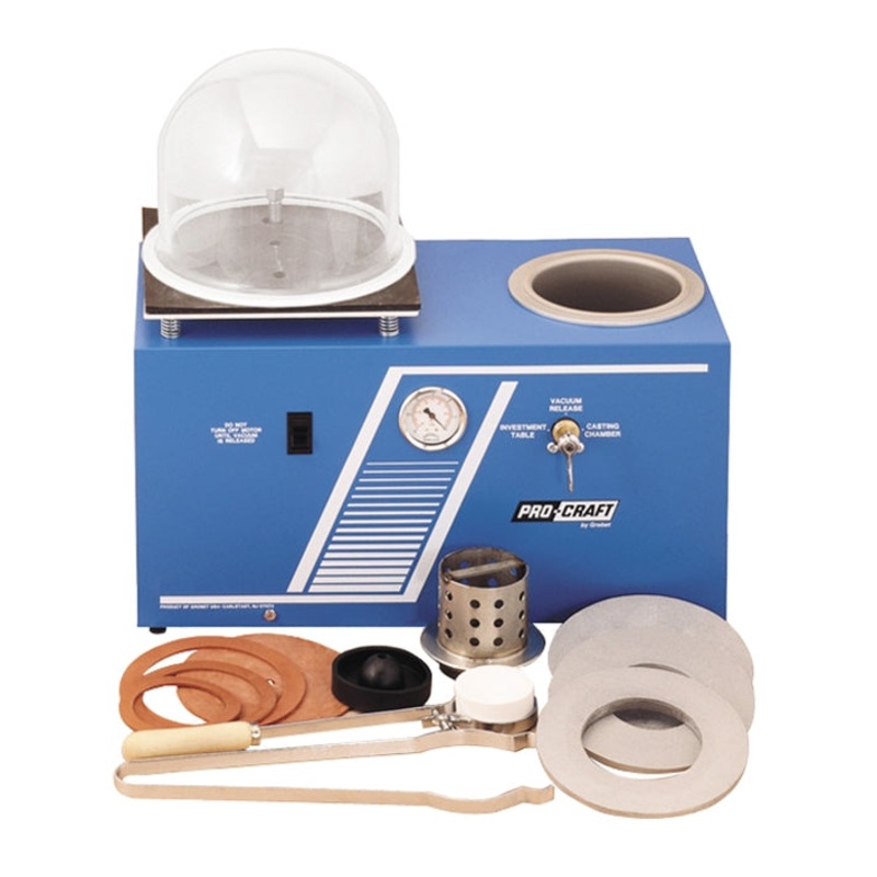 This three-in-one unit invests under vacuum, casts perforated flasks under vacuum, and casts regular flasks under vacuum. The machine measures: 23″ wide x 11″ in diameter x 13-1/2″ in height. Investing is performed on a 10-1/2″ square platform which can be vibrated to eliminate air and bubbles. Unit accommodates perforated flasks up to 5″ in diameter and 7″ high. Pressure created by the powerful vacuum unit pulls molten metal into the most intricate patterns. Vacuum assist casting can also be done on this unit with regular solid wall flasks. Unit comes complete as shown.