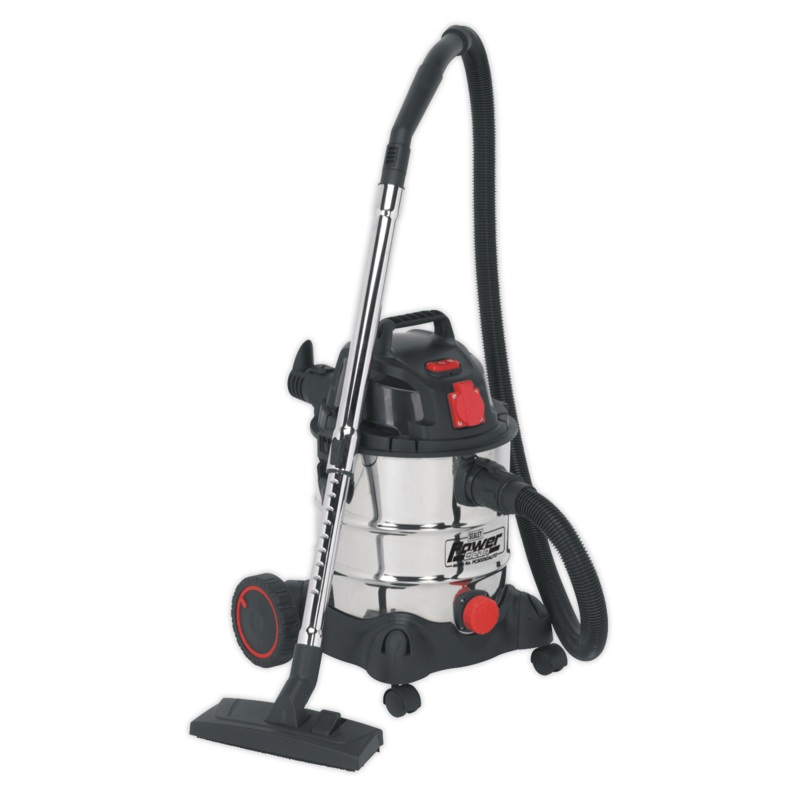 Powerful 1400W motor head gives incredible suction through 35mm hosing. May also be used as a blower. Integral 3-pin socket provides power supply for dust-free tools up to 1400W. When operating in conjunction with a power tool, the cleaner automatically starts with the tool and stops 10 seconds after the tool is switched off, to ensure tool and hose are left free of dust. Stainless steel drum on two castor and two fixed wheels, stainless steel telescopic rigid extension tube as well as tools for wet and dry operations. Tool storage points on head and base. Supplied with cartridge filter and wet-use foam filter.