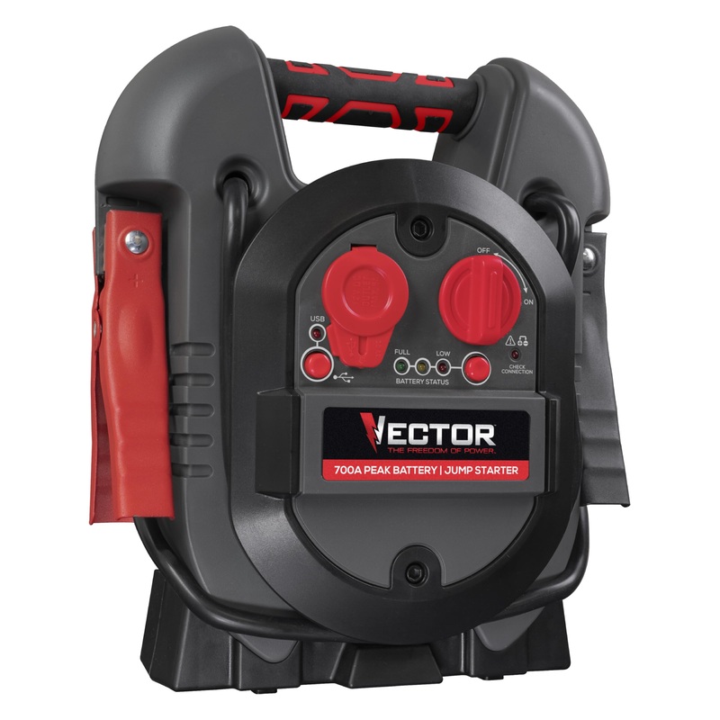 The VECTOR J312V is a portable jump starter and power bank in a take along size. 700 peak amps of starting power instantly jump starts V4 and V6 cars and trucks. Powder-coated metal clamps are included. The reverse polarity protection assures that jumper c