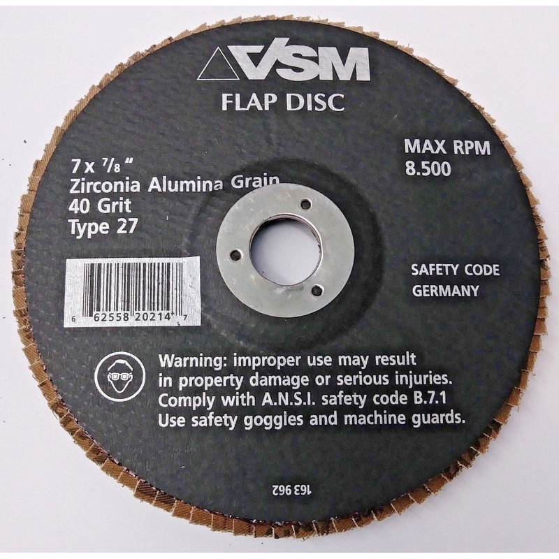 VSM 163 962 7" x 7/8" Zirconia Alumina Grain 40 Grit Type 27 Flap Disc GermanyMax RPM 8,500If you are on our eBay store, and are interested in more of our items, we do offer combined shipping!Please understand we cannot see any items in your shopping cart!