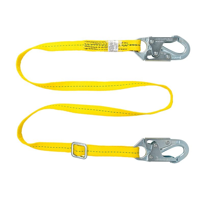 An adjustable web lanyard constructed from 1 wide polyester web. The lanyard features a steel locking snap hook (1706) on each end for connection purposes.