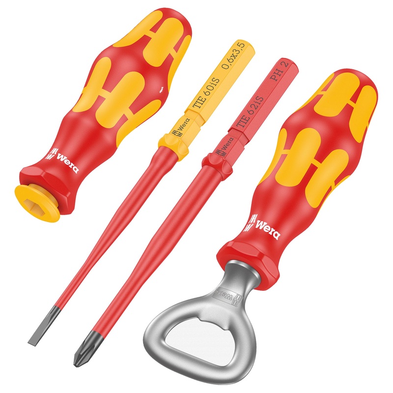 3-piece tool set plus one bottle opener in advertising-free, Christmassy gift packaging. One 817 VDE Kraftform bitholding screwdriver for Wera Kraftform Kompakt VDE interchangeable blades, 2 Kraftform Kompakt VDE interchangeable blades (slotted and Phillip
