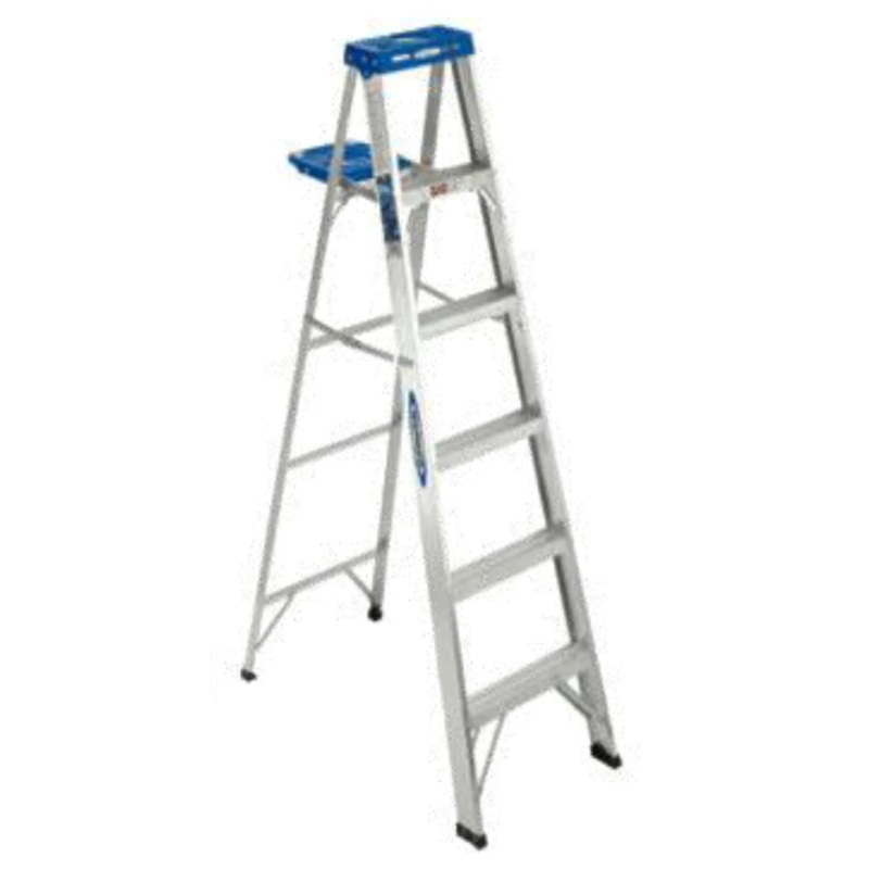 Werner Aluminum A-type Step LadderTOOL-TRA-TOP convenient tray for tools/paint can and slots for paint roller traySturdy molded paint can hanger on back of topSlip-resistant TRACTION-TRED stepsExternal PINCH-PROOF spreadersBottom and top steps bracedSlip-r