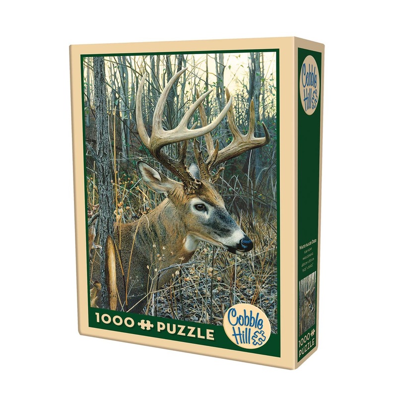 Bathed in the soft light of sunrise, the White-tailed Deer 1000 Piece Puzzle 80134 captures a buck perfectly camouflaged among the trees and tall grass. Illustrated by Jay Kemp, this nature-filled challenge features premium materials, uniquely shaped piece