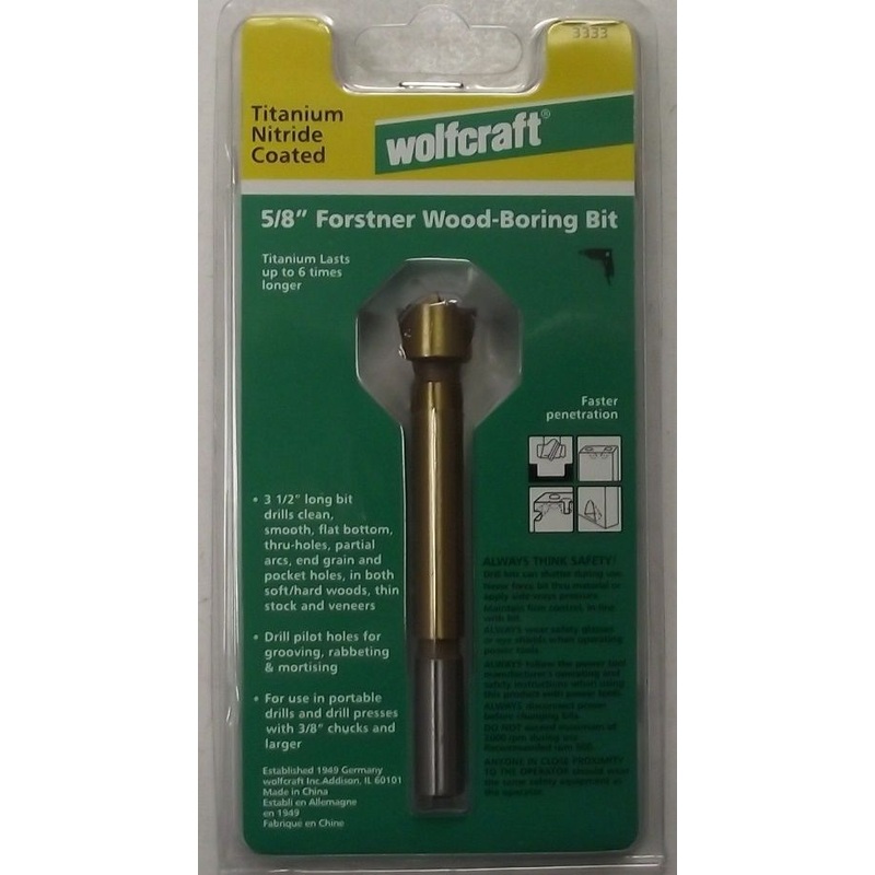 Wolfcraft 3333 5/8" Forstner Wood Boring Bit Titanium nitride coated lasts up to 6 times longer. 3-1/2" long bit drills clean, smooth, flat bottom thru holes, partial arcs, end grain and pocket holes, in both soft/hard woods, thin stock and veneers. For us