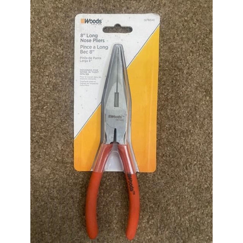 Woods 58749540 8" Long Nose Pliers, Carbon Steel Construction8-inch Long nose pliers designed for use in tight spaces.Forged carbon steel construction for strength and durability.Durable induction hardened side-cutting knives.Riveted pivot joint provides s