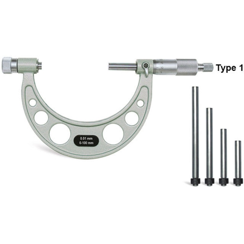 YAMAYO INTERCHANGEABLE OUTSIDE MICROMETER 0-6 RANGEFEATURESWide measuring range with interchangeable anvils.Satin chrome scale.Durable frame with insulated grips.Carbide tipped measuring faces.Provided with Ratchet stop for constant force.Supplied with set