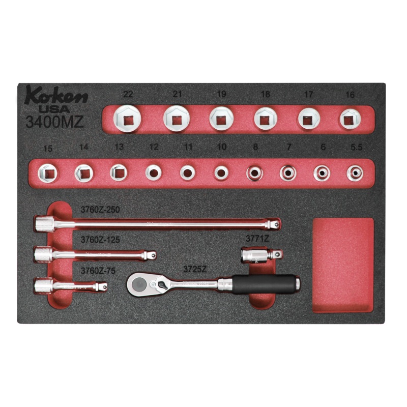 Input Drive Size:3/8"Drive Shape:SquareFoam Length:377mmFoam Width:254mmFoam Color:Select BelowIncludes:Don't need the complete set?Click here to buy items individually3400MZ Z-Series 6 Point Sockets5.5, 6, 7, 8, 10, 11, 12, 13, 14, 15, 16, 17, 18, 19, 21,