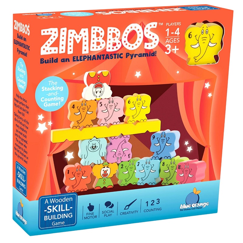 Zimbbos is a super fun stacking and counting game featuring colorful, wooden elephants. Players take turns rolling the die to find out how many elephants they must stack onto the pyramid. Whoever manages to get the last elephant on the pyramid wins the gam