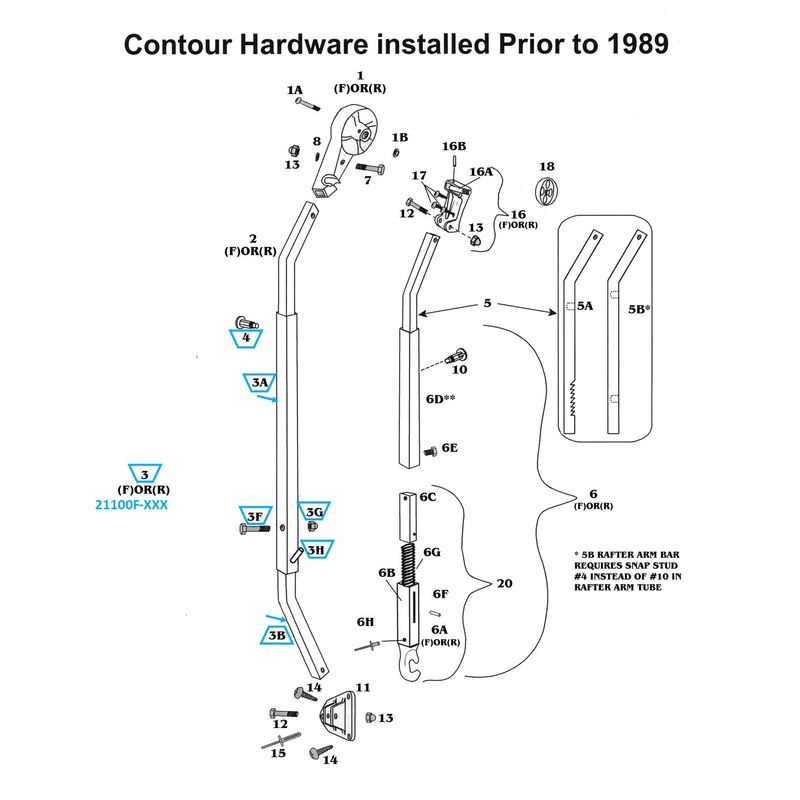 Zip Dee Bright '88 Front Main Arm Tube Assembly includes:211000-XXX Bright '88 Main Arm Tube (3A)211300-XXX Bright '88 Hinge Bar (3B)310040 Hex Head Bolt 1/4-20 x 1-1/4" (3F)311020 1/4-20 Aluminum Cap Nut (3G)313180 Claw Pin (3H)290002 Snap Stud Assembly (